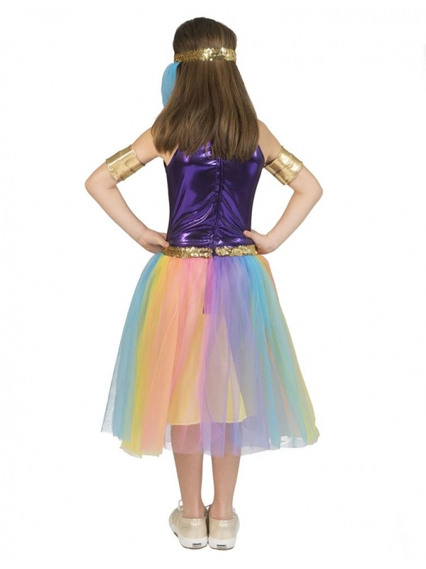 Une robe avec un haut violet brillant, orné de galon doré au niveau du cou et de la ceinture. Le bas de la robe rappelle un tutu avec une succession de pan de foulards de toutes les couleurs. Sur les bras votre fille portera des brassards en tissu couleurs or pour rappeler les bijoux de bras que portaient les odalisques.