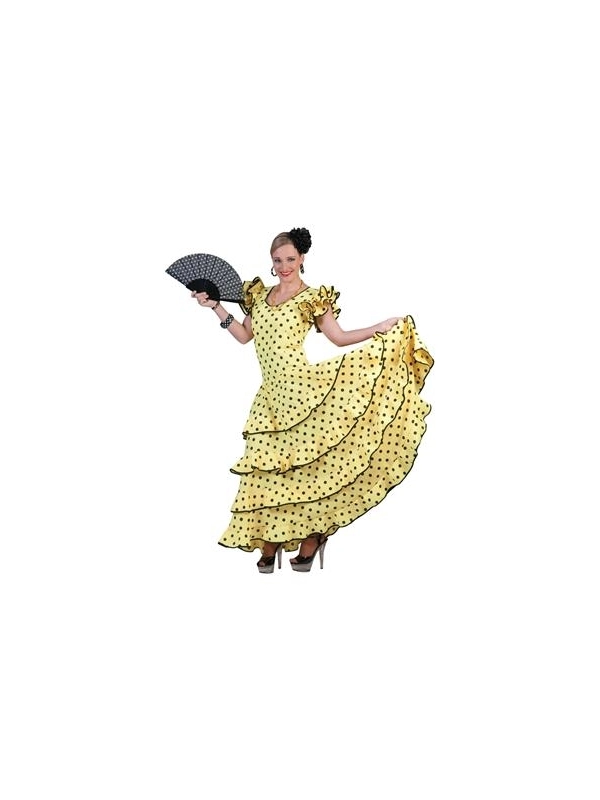 Découvrez notre magnifique robe de flamenco femme jaune à pois noirs pour des soirées pleines de grâce et de passion !