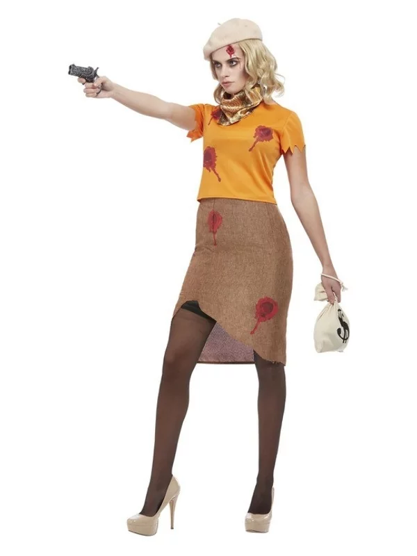 Le costume évoque le personnage mythique de Bonnie, une criminelle des années 1920-1930, transformée en mort-vivant. Le costume se compose d’un petit haut fluide orange et d’une jupe marron déformée à l’avant. Le béret beige et l’écharpe à motifs portée autour du cou complètent parfaitement la tenue.