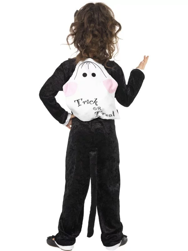 Le déguisement comprend une combinaison noire (fourrure blanche aux extrémités, rond central tacheté et clochette au cou) et un masque noir (nez rose, forme de visage de chat et élastique de maintien).