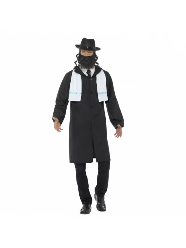 Ce déguisement de rabbin adulte comprend un manteau noir, une écharpe blanche, un chapeau noir avec deux longues boucles de cheveux attachées (les papillotes), ainsi qu’une longue barbe noire et une moustache. La barbe et la moustache se fixent sur le visage grâce à un élastique que vous passerez derrière la tête. Vous pouvez également porter une paire de lunettes pour être encore plus fidèle au personnage.