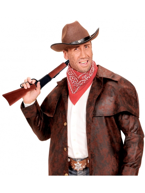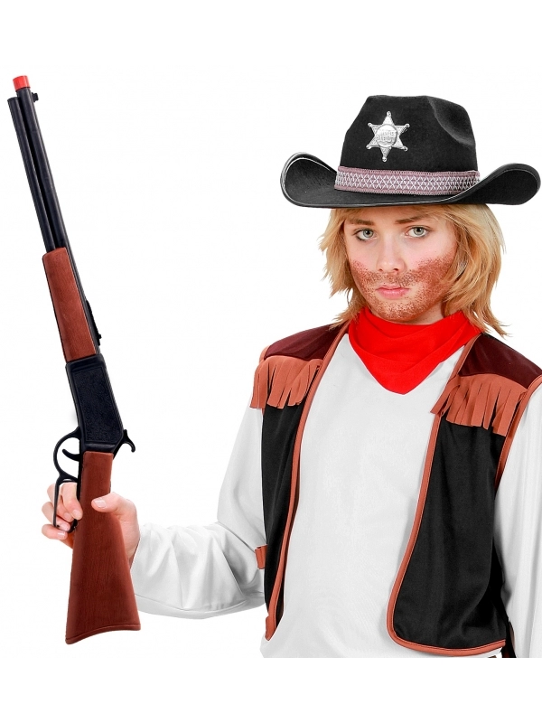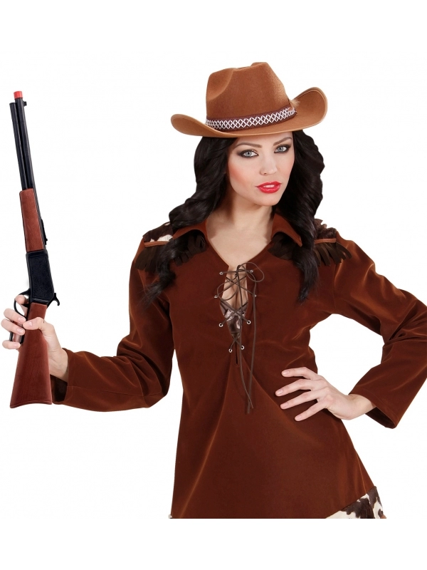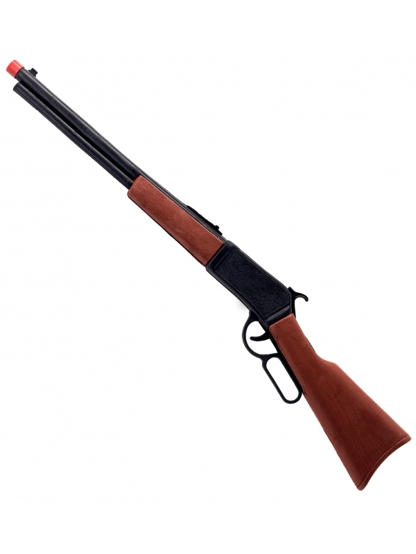 Complétez votre déguisement avec cette carabine. Elle est en plastique marron et mesure environ 60 cm de long.