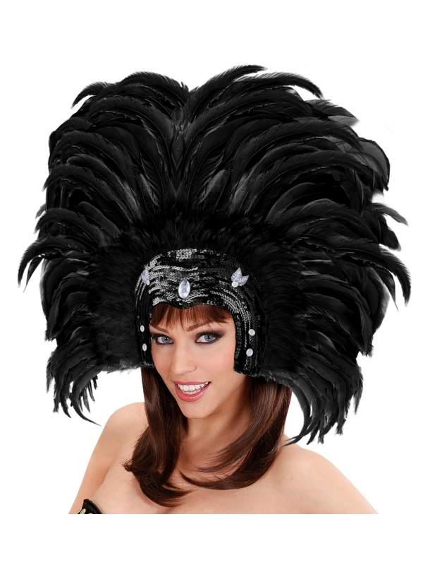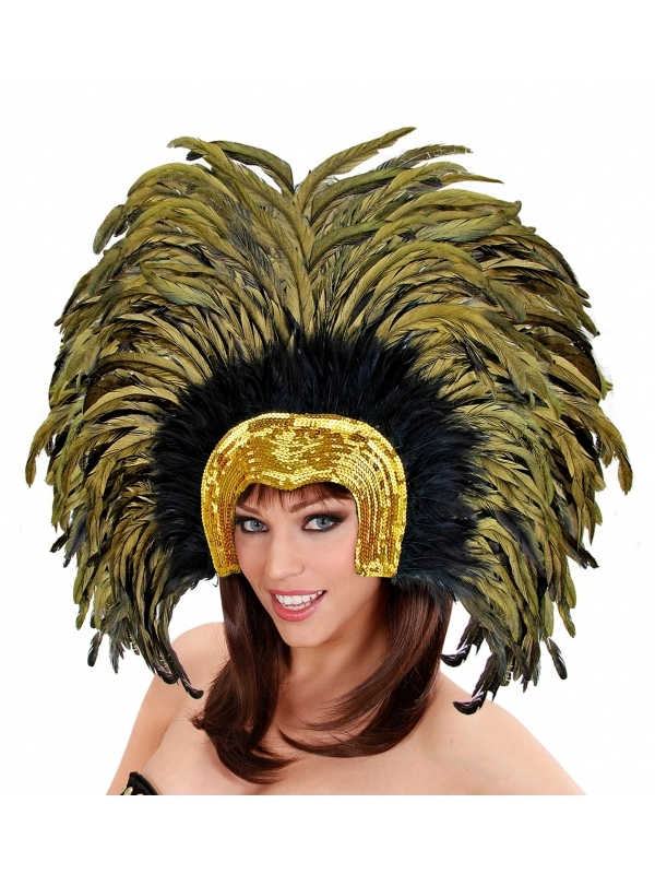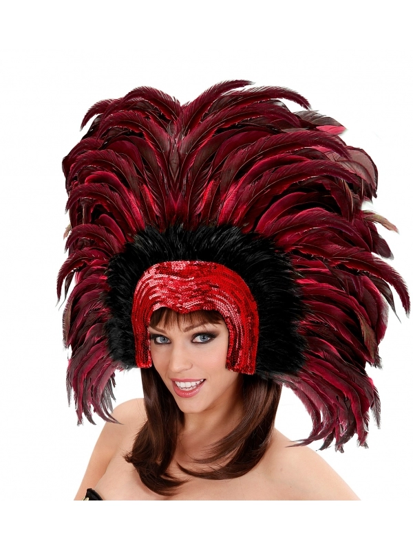 Vous aurez le choix entre 5 couleurs : doré, rouge, bleu, vert et noir. Les coiffes sont composées de plumes et de sequins.