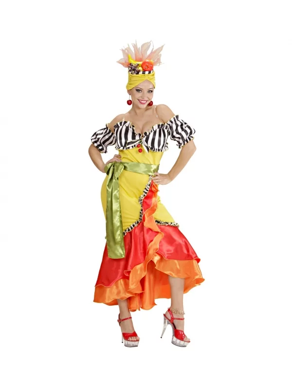 Ajoutez à cela la coiffe fruitée qui accompagne la panoplie, et vous avez tout un personnage habillé à la gloire des fêtes dans votre miroir. Il ne vous reste plus qu’à vous maquiller et à mettre les bijoux carnavalesques adaptés.