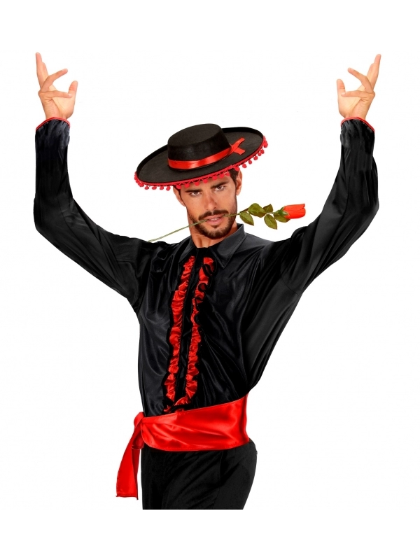 Déguisement Espagnol/ flamenco homme rouge et noir avec chemise à jabot & large ceinture.