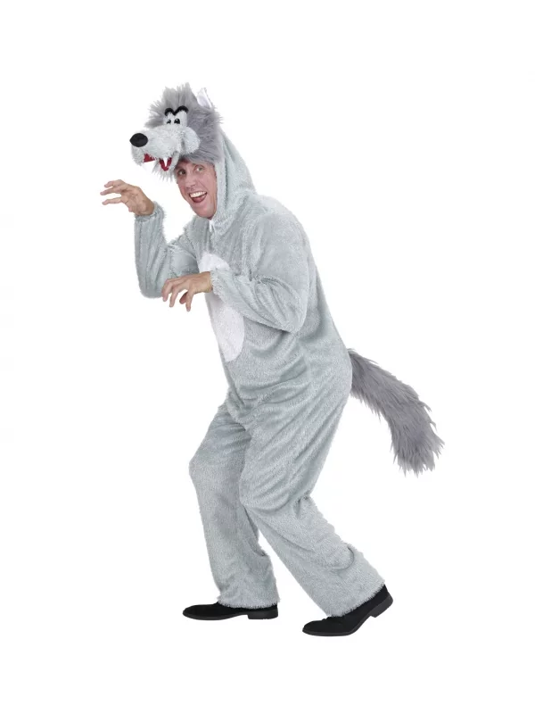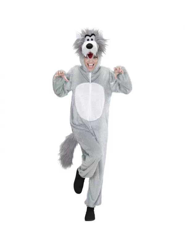 Il s’agit d’une combinaison à capuche gris et blanc. La tenue est facile à enfiler puisqu’elle est dotée d’une longue fermeture discrète sur le ventre. La capuche recouvre la tête et c’est sur elle qu’est fixé le masque, représentant la tête du loup. Celui-ci est pourvu d’un long museau, de canines bien pointues, mais aussi de 2 grands yeux presque attendrissants. Évidemment, la combinaison est dotée d’une longue queue bien velue.