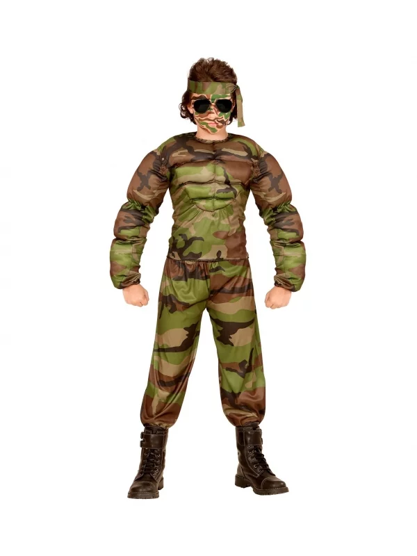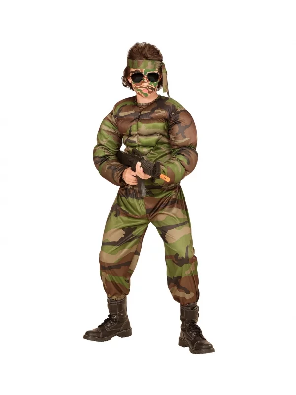 Déguisement militaire super muscle garçon (t-shirt muscle, pantalon, tour de tête) – le costume parfait pour conquérir les amis !