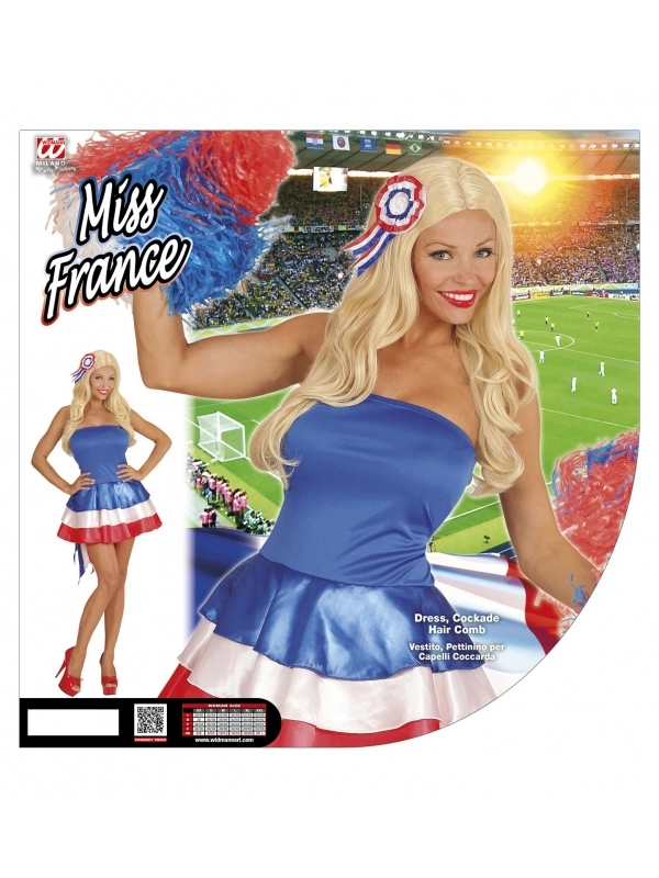 La robe est un un bustier bleu qui vient épouser votre buste, le bas est une jupe à volants aux couleurs de notre beau drapeau. Ce déguisement comprend également une une pince à cheveux cocarde que vous poserez délicatement sur votre coiffure.