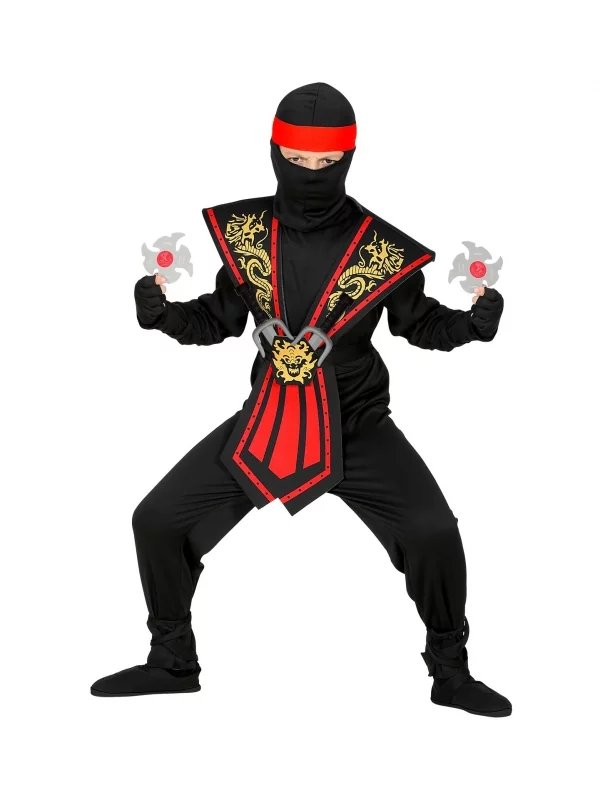 Ce déguisement de ninja garçon comprend tout ce dont votre petit guerrier a besoin pour se transformer en un redoutable ninja : une combinaison noire et rouge, une armure assortie, des protections pour les bras et les jambes, une ceinture, des gants, un bandeau et un masque. Mais ce n’est pas tout ! Le déguisement est également fourni avec deux dagues de ninja et deux étoiles à lancer, pour encore plus de réalisme et d’aventures imaginaires.
