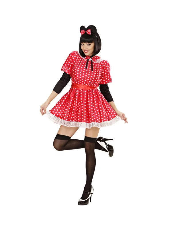Le déguisement Souris femme comprend une mini robe rouge à pois blancs doublée d’un jupon noir qui déborde légèrement sur la longueur, une ceinture, un serre-tête à oreilles de souris enjolivée avec un joli nœud.