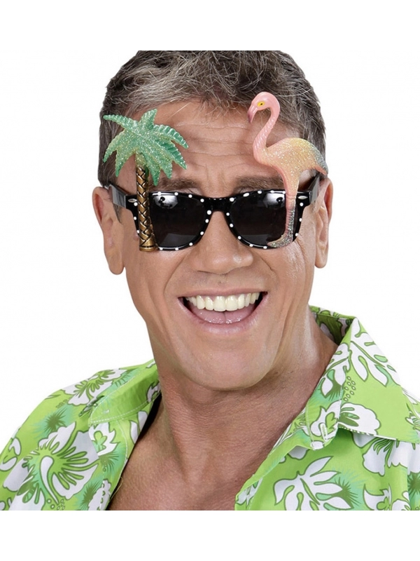 Lunettes fantaisies tropicales avec flamand rose et palmier pour vos soirées d’été, soirée hawaïenne ou enterrement de vie de célibat.